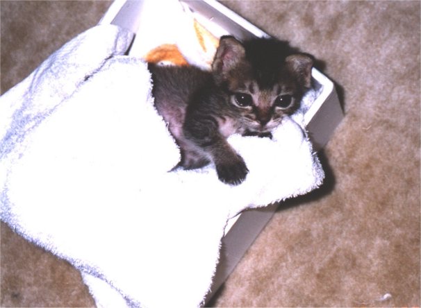 2001年10月1日 拾ってきて間もない時のショット! まだ、起き上がれず生死の境を漂っているときのもの?それとも、やっとミルクを飲めるようになったくらいかな? んっ!んっ!生死の境?ミューの生立ちをご覧ください。 |
