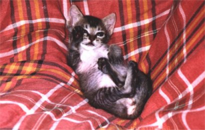 2002年??月??日 同じく1歳くらいの時のものです。 見て下さいこの格好を!完全無防備です。 猫は、しっぽとかお腹を触ると嫌がりますよね〜。 この後、思う存分にお腹を触ってやりました。 |