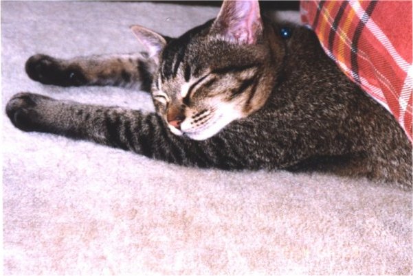 2004年6月20日 ミューの写真は、寝ているときの物が多いんです。 耳のすぐ下にある傷跡が分かりますか? 宿敵の茶トラと喧嘩したときにつけられた傷です。 |